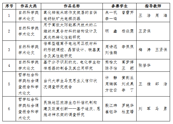 在湖北省第十二届“挑战杯”大学生课外学术科技作品竞赛中,sunbet申愽《氧化锌微米球作支架层的自供电钙钛矿光电探测器》、《用于高效太阳能蒸汽技术的二维纳米复合材料的结构设计及其光热转化性能研究》、《倍率型锂离子电池用正极材料的形貌调控、晶面设计、碳基复合及其性能研究》、《基于分子识别的光、电化学生物传感器的制备及其应用研究》四个项目获得一等奖,《当代大学生马克思主义信仰状况调查研究报告》、《民族地区旅游生态补偿机制构建及政策创新》两个项目获得二等奖,以上六个项目将代表sunbet申愽参加第十六届“挑战杯”全国大学生课外学术科技作品竞赛。