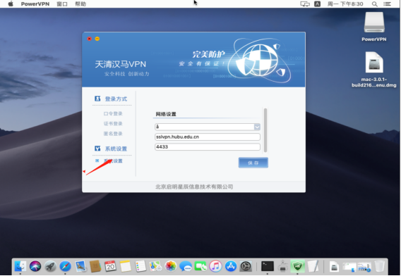 打开后如下图,点击系统设置,名称自定(不影响),网关输入sslvpn.hubu.edu.cn;端口填写4433