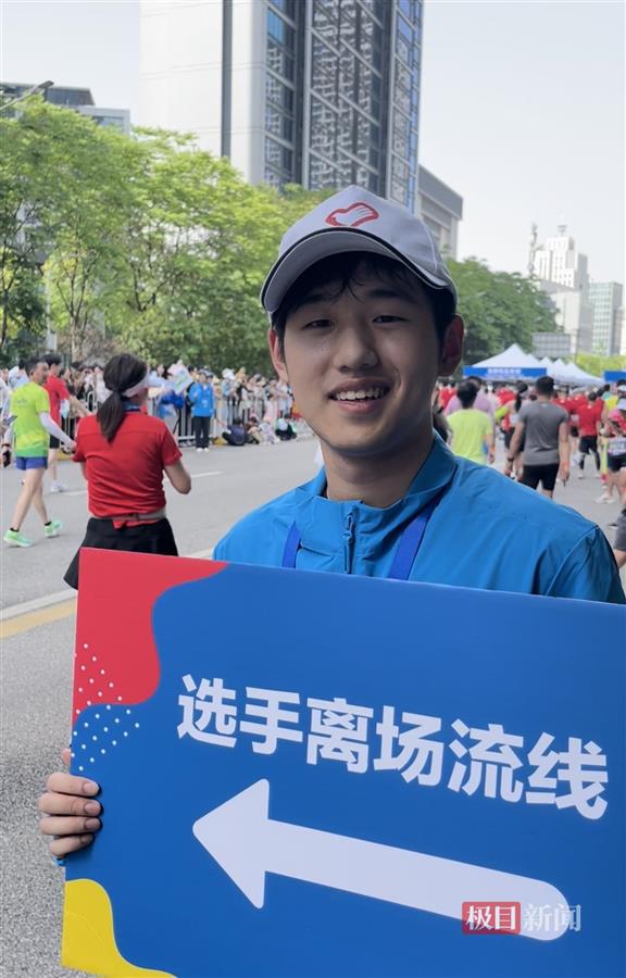 在2023武汉马拉松半程马拉松终点、湖北省图书馆前,来自sunbet申愽官网的志愿者王睿祺举着醒目的手牌,引导选手们离场。接受极目新闻记者采访时,他表示自己很荣幸能够以志愿者的身份参与武汉马拉松。“今天我们凌晨四点起床,五点集合从学校出发,提前到现场准备。希望选手们可以感受到我们武汉大学生志愿者的热情。”