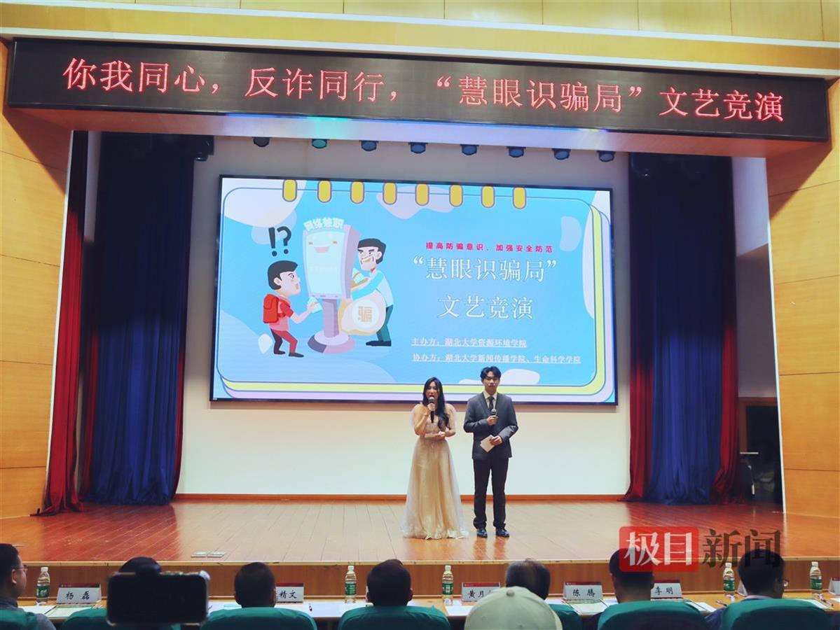 活动中,10组来自不同专业、不同年级的学生们各显神通,用歌曲、小品、相声、情景剧等多种形式来演绎不同场景下的诈骗故事。资源环境学院带来的相声《你好,骗子》,从“中奖交税”“谎称亲人出事”“点击验证码或链接”3个故事为大家展示骗局类型,进行防诈教育,现场观众被逗得捧腹大笑。随后在互动环节,随机抽取的3位观众答对题目,并获得奖励。