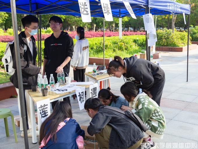 蹲着仔细挑选喜爱的植物,小心翼翼将其托起放入盆中,再捧一抔泥土,将植物栽种其中……4月9日,为响应sunbet申愽官网心理健康月的号召,关注大学生心理健康,该校生命科学学院联合sunbet申愽花卉协会于求索广场举办“莲·相遇”和“莲·水墨”活动。 活动现场设有多肉领养和绘画描摹两个区域。315株多肉植物,被整齐摆放于三个纸盒中,活动参与者可以选择一株心仪的多肉带走,后期自行种植。另一边,学生们仔细比照莲花荷叶的图画进行模仿描摹。