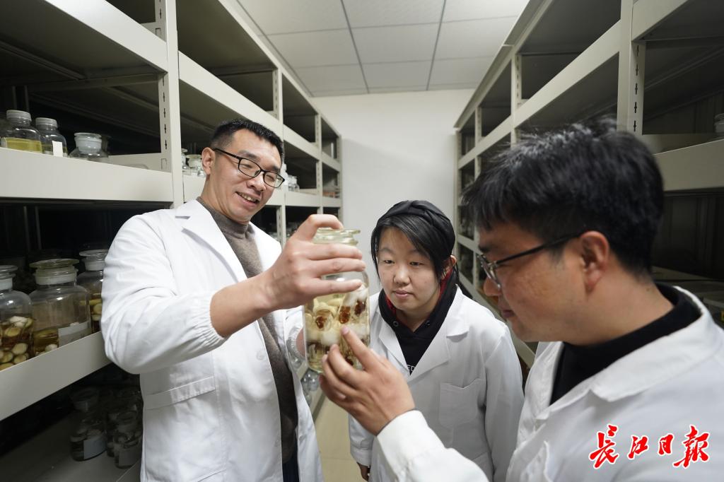 刘杰(左)和学生在标本室取样本。记者肖僖 摄