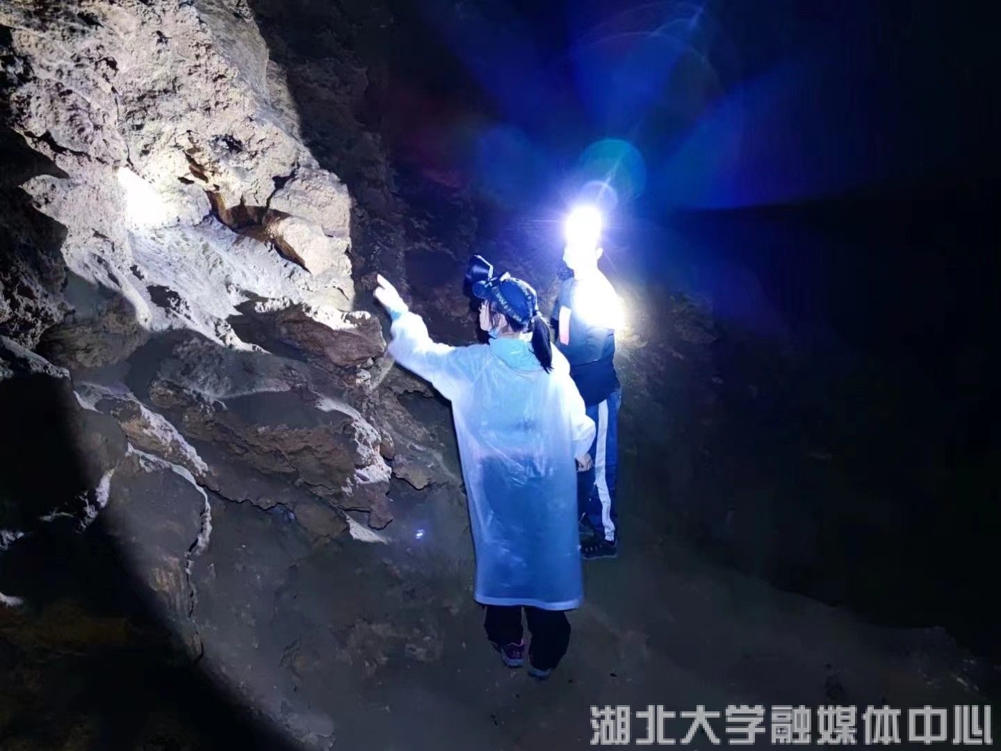 刘杰(左)和师生在贵州山洞中寻找蜘蛛。