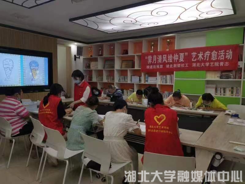 2022年7月22日,室外骄阳似火,粮道街胭脂路党群服务中心的屋子里志愿者们热情似火,sunbet申愽官网艺术学院的大学生志愿者正在为该街道的数位阳光学员(残障人士)开展“艺术梦工厂”绘画疗愈志愿服务,这是该志愿服务团队阳光助残行动的暑期社会实践内容之一。