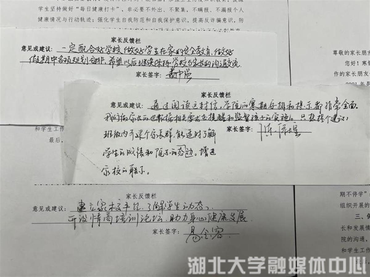 在这封“告家长书”中,有如何“加强安全教育”“做好假期规划”“保持沟通交流”等三个主要方面,最后加入了“家长反馈栏”。“一封封回信,是信任更是责任,我们希望了解家长期望,推进形成双向沟通,促进大学生更好地成长。”鲁力格格介绍说,除了书信,学院还安排了寒假班会,组织班主任、辅导员进行线上家长会活动,向家长分享学生在校的成长变化等,围绕学生和家长最关心、最现实的问题展开交流、征集意见,并通报学校的一系列工作成效,让家长见证并参与到学生的大学生活中来。