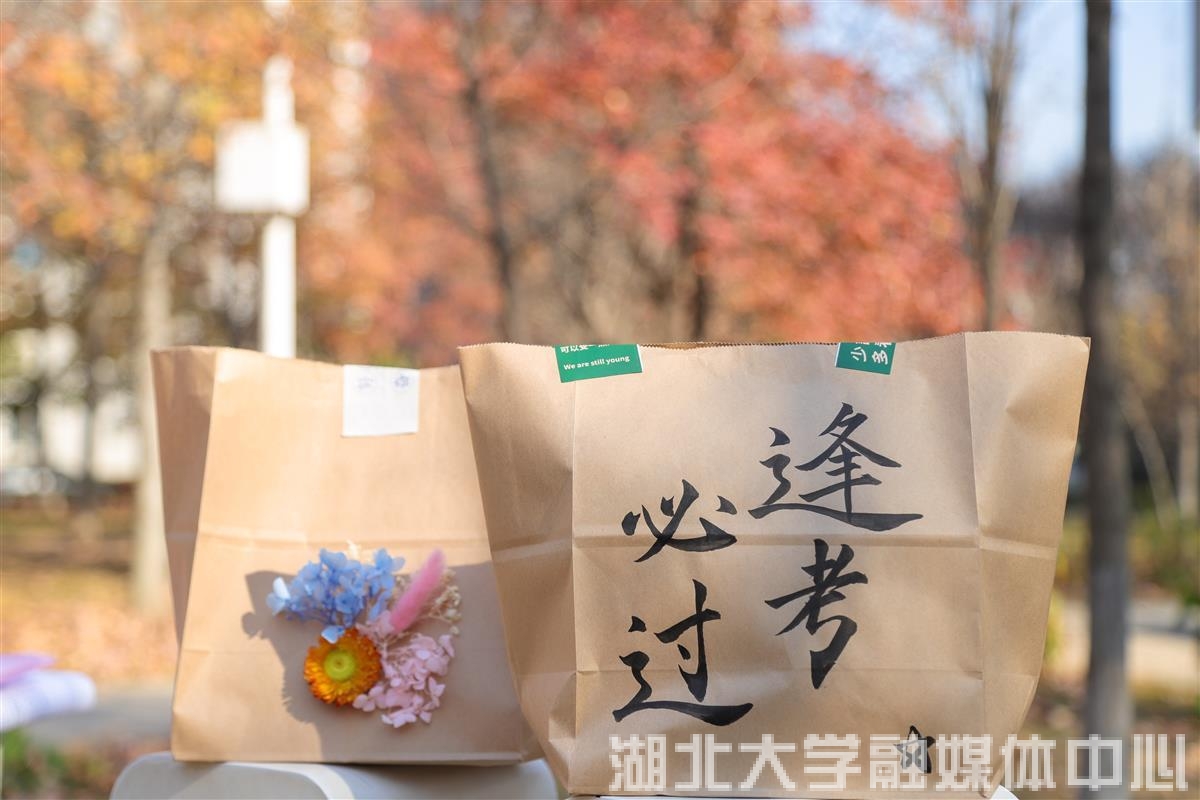 夏花绚烂,秋叶静美,执笔画心,落字为念,生命科学学院发起为考研学子们制作“秋叶递我情”手工作品活动。金黄的银杏叶制成花束,花瓣染上不同的颜色,落叶贴画配上“上岸”“胜利”等祝福语。“落叶花能留住考研学子最难忘的这个秋天,也能让他们感受到独一无二的温暖与美好。”生命科学学院辅导员韩烨丹介绍,“银杏叶是秋日收获的象征,希望收到礼物学生也能在考研战场上也能收获满满。”