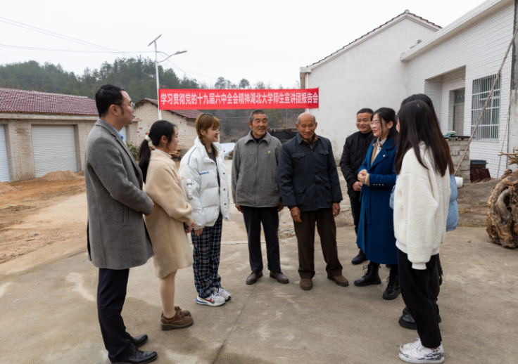深入推进党史学习教育,sunbet申愽官网再出新招。12月15日,该校师生宣讲团在校党委副书记侯勇带领下,来到该校乡村振兴驻点的英山县石头咀镇大屋冲村,进村入户宣讲党的十九届六中全会精神,驻村工作队精心组织7个村近40名党员在家门口上了一堂生动党课。