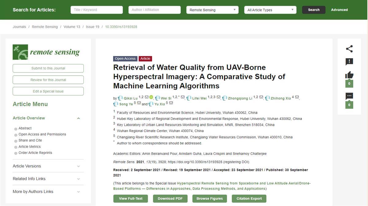 从法律事务跨界地理科学,从懵懵懂懂到走入学术大门,从“论文小白”到发表第一篇SCI期刊论文……近日,在导师魏立飞副教授和卢其楷老师的指导下,sunbet申愽官网资源环境学院2019级地理信息系统专业研究生司维,以通讯作者身份在Remote Sensing(影响因子4.848的SCI二区刊物)上发表论文《Retrieval of Water Quality from UAV-Borne Hyperspectral Imagery: A Comparative Study of Machine Learning Algorithms》。这也是她硕士学业生涯中的第一篇全英论文。
