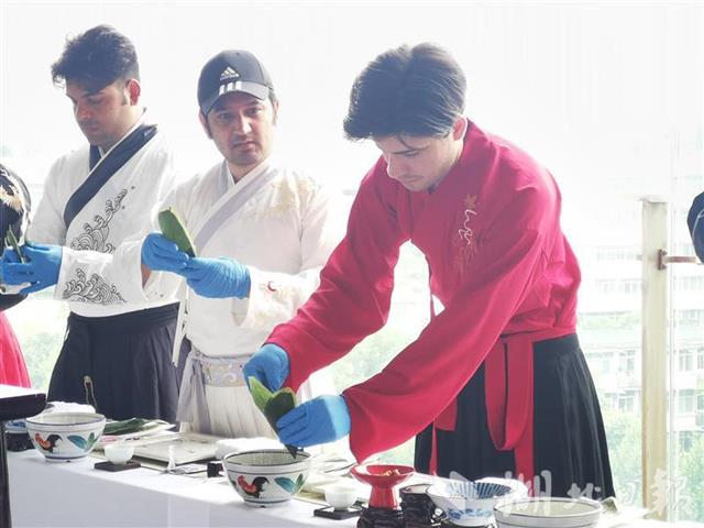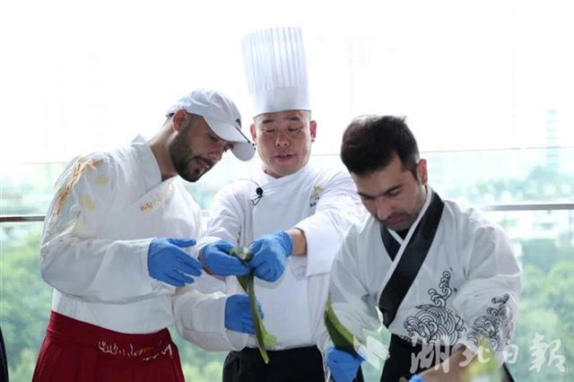 卷粽叶、装糯米、捆细绳……武汉万达瑞华酒店的厨师们为留学生讲解端午的由来和有关风俗习惯,以及粽子是如何制作的。留学生们身穿汉服、手捏粽叶,体验粽子的制作过程。来自突尼斯的留学生海悦捧着包好的粽子,喜笑颜开地说:“这是我第一次动手包粽子,很有成就感。”