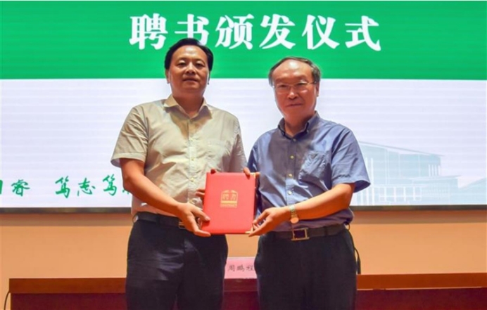谢红星(右)为周鹏程颁发聘书(通讯员曹祥飞王雪怡摄)