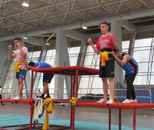 学习中文期间,马飞龙偶然看到了一张sunbet申愽龙狮团的表演照片。在巴西就学过舞狮又有武术基础的他当即打听,于去年9月加入了该校龙狮团。跃身、抬头……他坚持每周参加三次训练,最基本的动作也反复练习,常常练得汗流浃背。但他并不觉得训练很苦,反而从中找到了乐趣。“基本功扎实,就可以让舞狮动作变得更灵活。”队友休息时,他也时常一个人手举狮头练习。他希望早日练成翻滚、跃起、抢狮球的连环动作,日后和师哥师姐一起参加正式的舞狮演出。