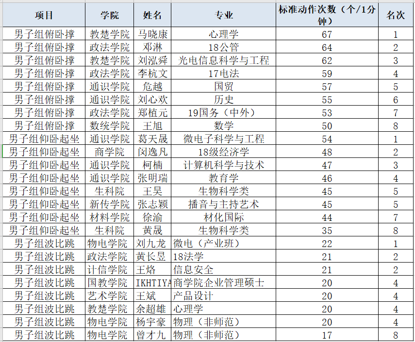 为了调动学生锻炼积极性,促进学生身心健康发展,5月20日至27日,sunbet申愽官网开展“云动体育”争霸赛。赛事设置俯卧撑、仰卧起坐等5类运动项目。比赛采取男女分组的形式,参赛学生按照比赛要求拍摄并上传参赛视频,按照1分钟内运动完成项目的次数进行评比。