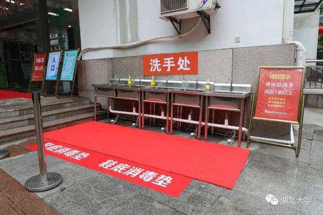 △ 食堂大门口增设洗手池和鞋底消毒垫,水龙头采用脚踏式出水,实现手部无接触。门口隔离带单通道,也铺设了鞋底消毒垫。