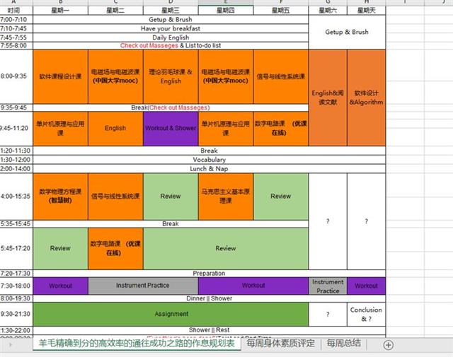杨心悦说,她一直秉承着“今日事今日毕”的原则,在开学前便制定了精确的时间规划表。每到周末,她会根据自己的实际完成情况打分,分析调整学习状态,并实行自我激励机制,激发学习热情。同时,结合课程和自身学习特点,安排好下一周的学习任务,并对任务完成情况进行追踪。