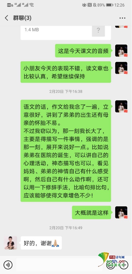 这是2016级会计学专业的郝明威与辅导小学生家人的聊天截图。每天下午三点,是他的开课时间,下课后,他会根据学生当天的学习情况进行反馈总结。郝明威的父亲母亲、姐姐姐夫都是防疫一线的医务工作者,作为“逆行者”的家属,他深知其不易,于是积极报名参加此次志愿活动,“不能赶赴一线,就想发挥特长,为疫情做点贡献。”