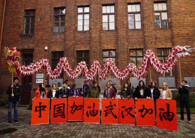 师生们自发组织活动,助力中国抗击疫情。2月21日,波兰雅盖隆学院孔子课堂的师生手持“中国加油,武汉加油”字画,舞起中国龙,自发地在托伦老城进行巡游,并在哥白尼广场齐声祝福:“中国加油,武汉加油,中波友谊万岁!”雅盖隆学院孔子课堂波方理事、托伦市副市长Zbigniew Rasielewski先生满怀激情地说:“武汉是座英雄的城市,相信它一定会好起来!托伦与你同在!”