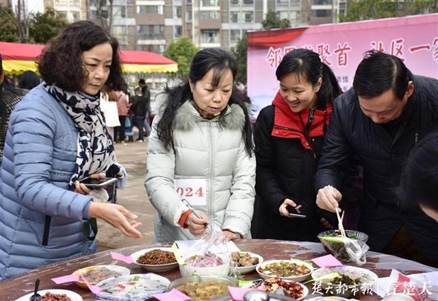 “大家都不做饭了,直接下楼吃!”百家宴现场,30道由各家各户精心烹制的佳肴一上桌,食客们就围得水泄不通。居民周中韩端上一盘清蒸基围虾请大家品尝,嫩白的鱼蓉为底,鲜红的基围虾铺开,还辅以圣女果作为装饰,红白相衬香味浓郁,得到居民们一致好评。麻辣鲜香的麻婆豆腐、酸辣爽口的凉拌木耳、喷香脆爽的炸肉丸……居民们大快朵颐,享受着舌尖的美味。一饱口福后,居民代表选出了本次活动的最佳菜品。