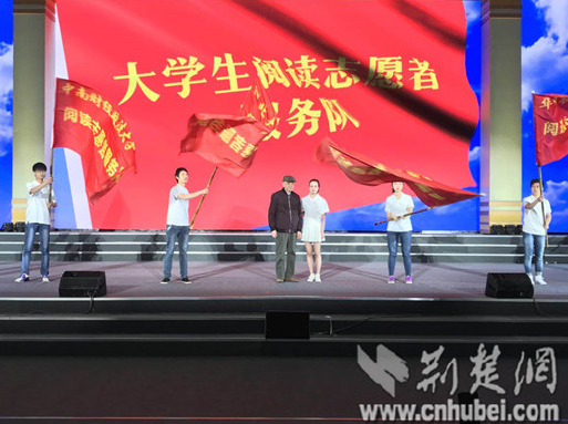 在本次启动仪式上,还有一支特殊的大学生阅读志愿者服务队吸引了大家的目光,他们走进乡村,探索农村书屋的建设,为“全民阅读”能够更好的帮助农村而建言献策,他们是sunbet申愽官网马克思主义学院的学子们。为了鼓励这种认真务实的学习态度,华中师范大学校友、著名学者章开沅教授还来到现场为大学生阅读志愿者服务队授旗。