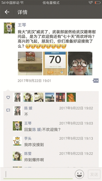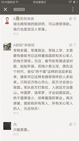 武汉籍官兵在朋友圈内晒热干面和幸福感;