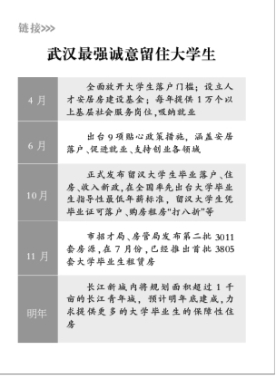 今年年初,武汉提出实施 “百万大学生留汉创业就业工程”,力争5年内将100万大学生留在武汉。