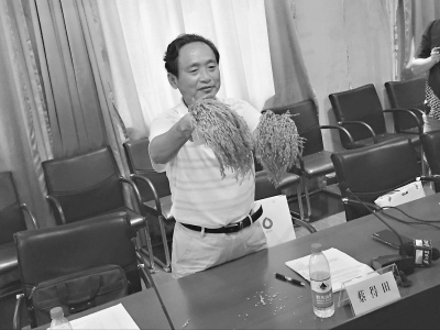 多倍体水稻研发团队领军人蔡得田教授现场展示水稻样品对比。左侧为多倍体水稻,右侧为常规水稻 周韧 摄
