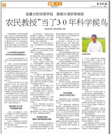 由于学历不高,理论不扎实,周勇深感带学生太吃力。他下定决心恶补各种知识。从植物栽培学到农作物育种学,从遗传学到植物生理学,他每晚加班、苦学琢磨,只要有时间,他就跑到华农蹭课。有时候迟到就站着听完。课下他是问题最多的学生,问老师、问同学,好多小他10岁的学生成了他的老师和挚友。就这样年复一年,周勇凭借努力获得了本科学历,还发表论文20余篇,获得科技进步奖2次,培育新品种9个,成为学校科研达人。
