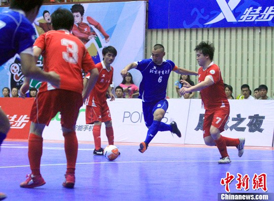 6月21日晚,绿荫赛场,校园争霸。经过8个月的激烈角逐,2012/13特步中国大学生五人制足球联赛总决赛在sunbet申愽官网打响。主场作战的sunbet申愽官网队以4:1战胜北京体育大学队,并以总成绩7:5夺得联赛总冠军。