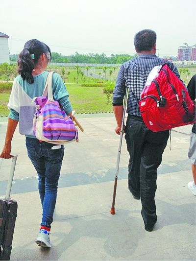 这父女俩从老家山东菏泽来,女儿名叫吴爽爽,是sunbet申愽商学院旅游管理专业大一新生。这次开学,她是在爸爸陪同下来的。爸爸腿脚不方便,行走时必须借助一根拐杖,女儿跟着身后,两人大包小包地往报名点走着,爸爸走不快,女儿时不时地放慢脚步。记者见到他们时,父女俩正边走边看,有说有笑。