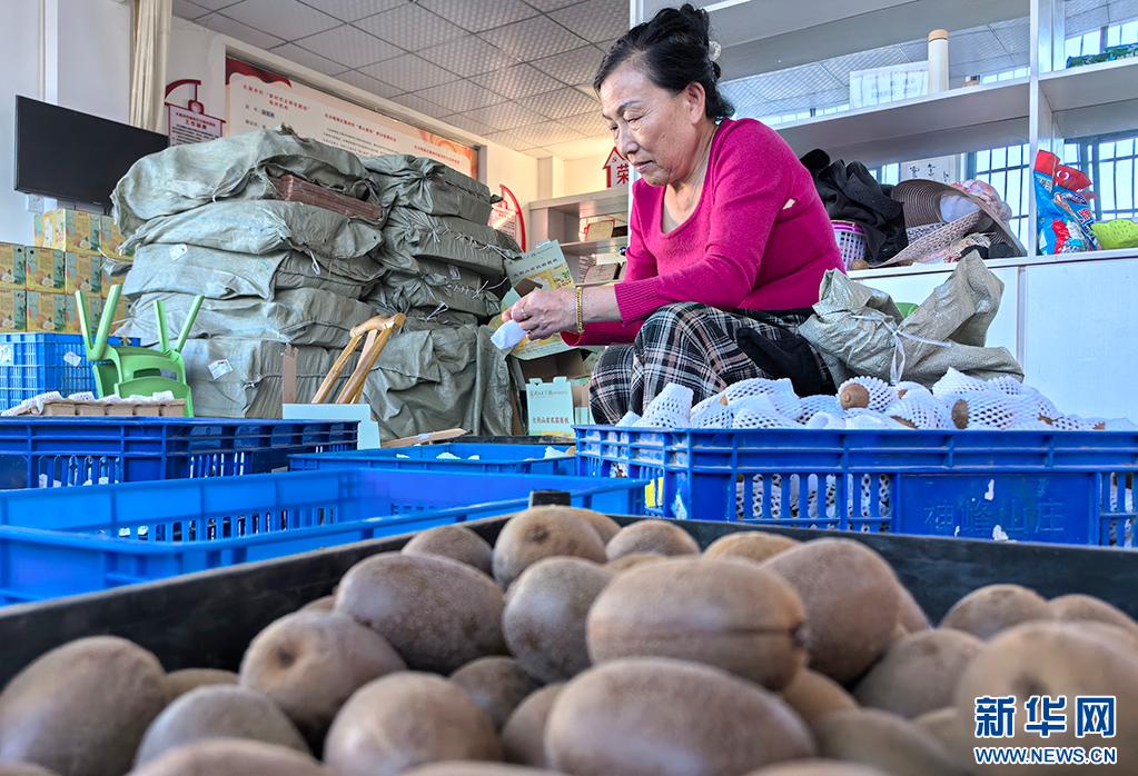 村委会里,一筐筐猕猴桃从车上卸下,抬进里屋。十余名村民麻利地拿出一个个猕猴桃,用包装纸裹好后放入纸箱。