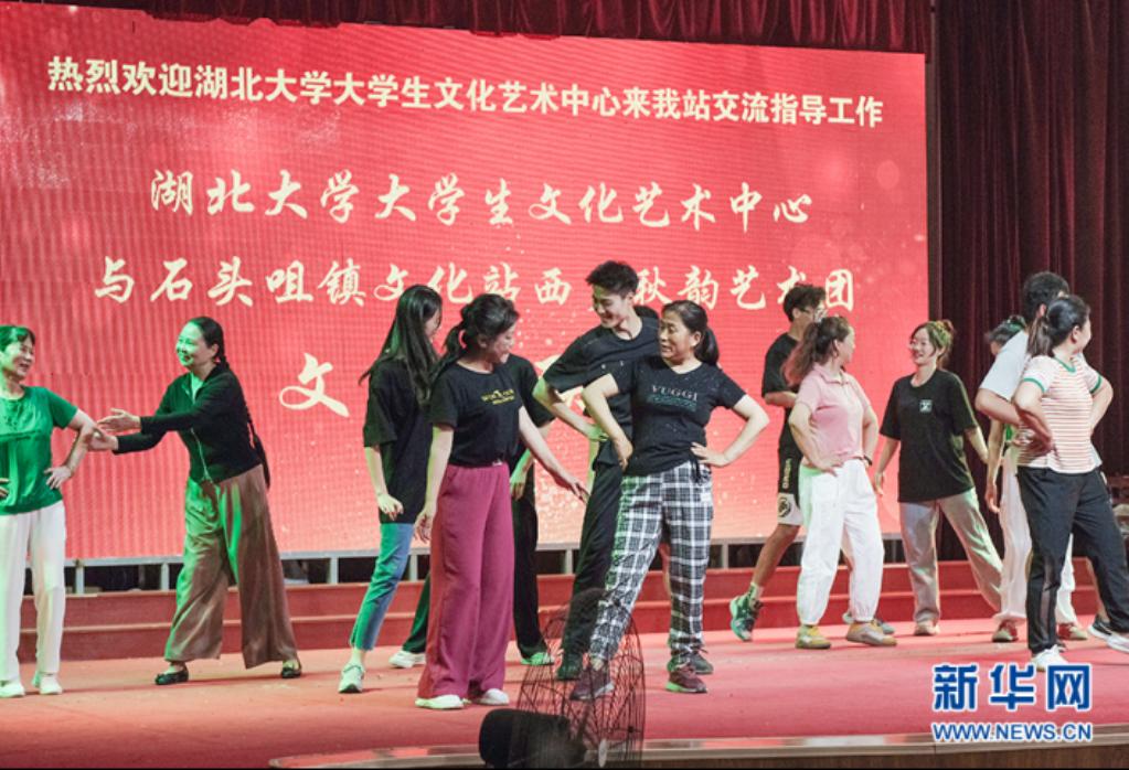 图为sunbet申愽官网大学生文化艺术中心舞蹈组成员为大屋冲村村民开展广场舞教学。新华网发 欧其晟摄