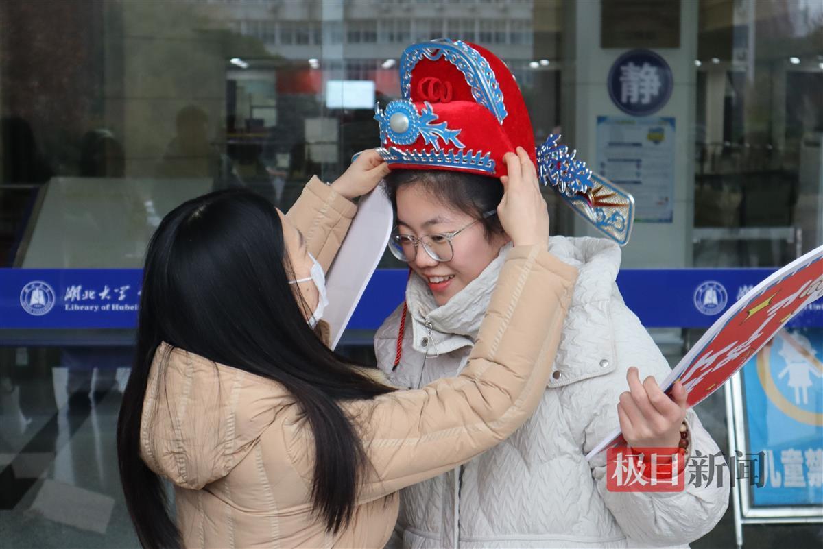 “再加把劲,碰到了一定高‘粽’!”12月18日,在图书馆门口,文学院举办了第六届“考研送温暖”活动。熊娟涓头戴“状元帽”,用力一跃,去顶用竹竿高举的粽子,想讨个“高中”的好彩头。学子们还将承载着对“研途”美好希冀的便利贴置于“金榜题名”立牌上,并取下立牌上粘有的棒棒糖,寓意“探花”。
