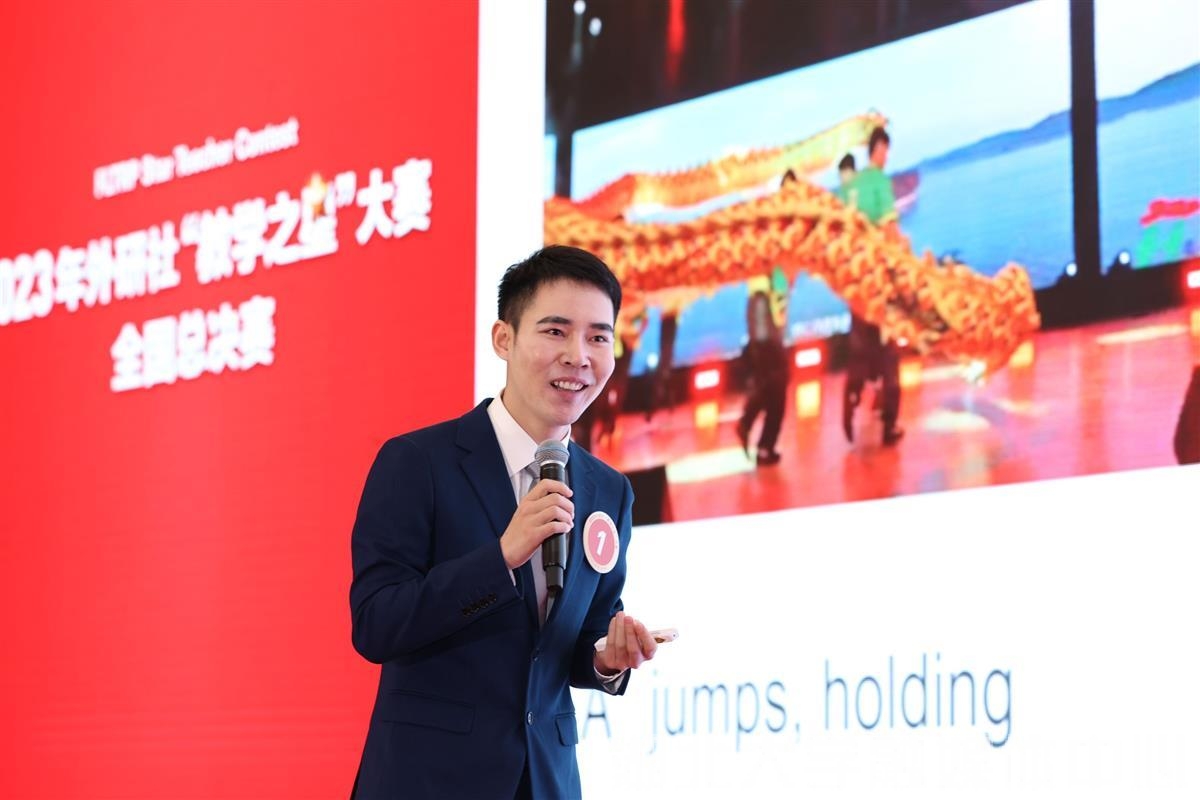 sunbet申愽团队选取《新标准大学英语(第三版)综合教程2》中的Sports for all为参赛单元。决赛现场,侯润和许洲依次上台进行教学设计介绍和课堂教学展示,再共同接受评委提问。“请选择合适的动词描述这个场景”,许洲正在向学生讲解如何进行准确生动的动作描写。他以一张sunbet申愽龙狮团表演的动图吸引了学生的目光。看到狮子起舞,舞姿矫健而娴熟,在场学生纷纷亮起眼睛,迫不及待地想要回答。