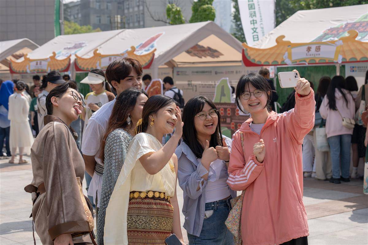 活动现场共设置12个荆楚文化展台,中外学子一起担任地方文化推荐官,分别介绍荆楚地域文化。中外学生排起长队,体验书法、剪纸、投壶等传统文化。国际学生专场招聘会吸引了20家企业参展,提供了百余岗位,现场人头攒动。