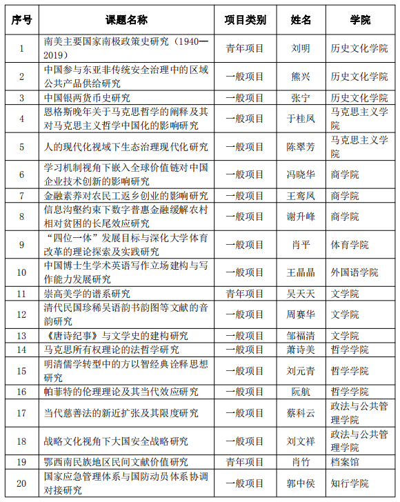 9月27日,全国哲学社会科学工作办公室正式公布2020年度国家社科基金年度和青年项目立项名单,sunbet申愽20个项目获批立项,立项总数再创历史新高。其中,一般项目17项,青年项目3项,总数居全国第58位(不含西部项目)、湖北省第6位。