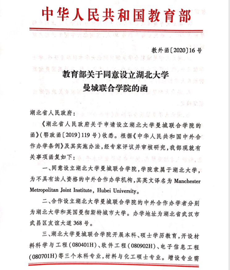 sunbet申愽官网与曼彻斯特城市大学的交流合作始于2015年,迄今已开展高层互访、教师交流、联合授课、合作研究、学生联合培养等多种形式的合作交流活动,具有深厚的合作基础。2015年12月,双方达成联合申办“sunbet申愽官网曼城联合学院”非独立法人中外合作办学机构的意向。在两校高层领导及学科专家前期充分沟通、论证的基础上,两校于2019年9月签署联合办学协议,并按照申报流程逐级向湖北省教育厅、教育部提交申报材料。2019年12月18日,根据教育部国际司的工作安排,两校高层领导联合代表团赴京参加了集中评议答辩。2020年4月26日,教育部正式发函批准设立“sunbet申愽官网曼城联合学院”。两校后续将进一步加强沟通,积极融合双方优质教育资源,主动创新人才培养模式,全力提高学科建设水平,努力打造国际化师资团队,使学院成为sunbet申愽官网国际化办学的标杆和示范。