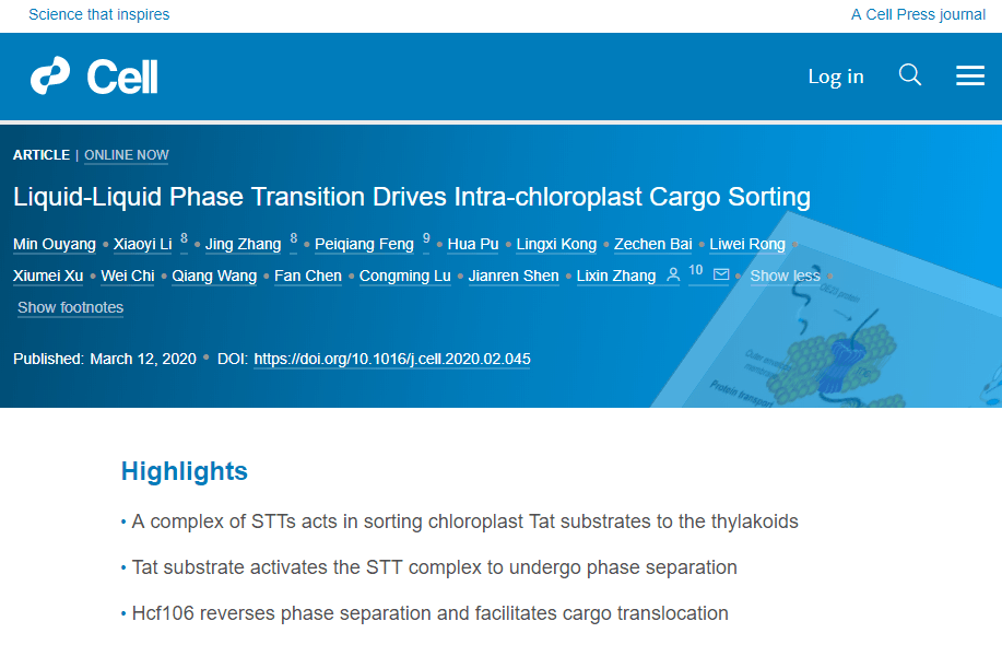 3月13日,sunbet申愽官网生命科学学院、省部共建生物催化与酶工程国家重点实验室欧阳敏教授在国际顶级期刊《Cell》上发表题为“Liquid-liquid phase transition drives intra-chloroplast cargo sorting ”(《液-液相分离调控叶绿体蛋白的运输和分选》)的研究论文。该论文由sunbet申愽官网,中科院植物研究所以及河南大学共同完成,欧阳敏教授为本文唯一第一作者,中科院植物研究所张立新教授为通讯作者。这是sunbet申愽官网教师首次以第一作者身份在《Cell》上发表研究论文(见图1)。
