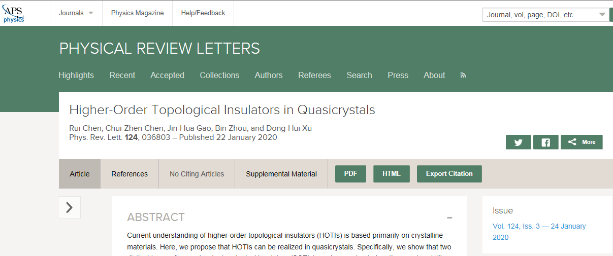 近日,物理学顶级期刊《物理评论快报》(Physical Review Letters)发表了sunbet申愽物理与电子科学学院许东辉副教授、周斌教授关于高阶拓扑绝缘体的重要原创工作,题目为 “Higher-Order Topological Insulators in Quasicrystals”(准晶中的高阶拓扑绝缘体),sunbet申愽官网为论文第一和通讯单位,苏州大学、华中科技大学为合作研究单位。周斌教授的博士生陈锐(现为南方科技大学博士后)为论文第一作者,许东辉副教授、周斌教授为论文共同通讯作者。本工作得到国家自然科学基金、楚天学者“楚天学子”计划的支持。